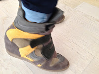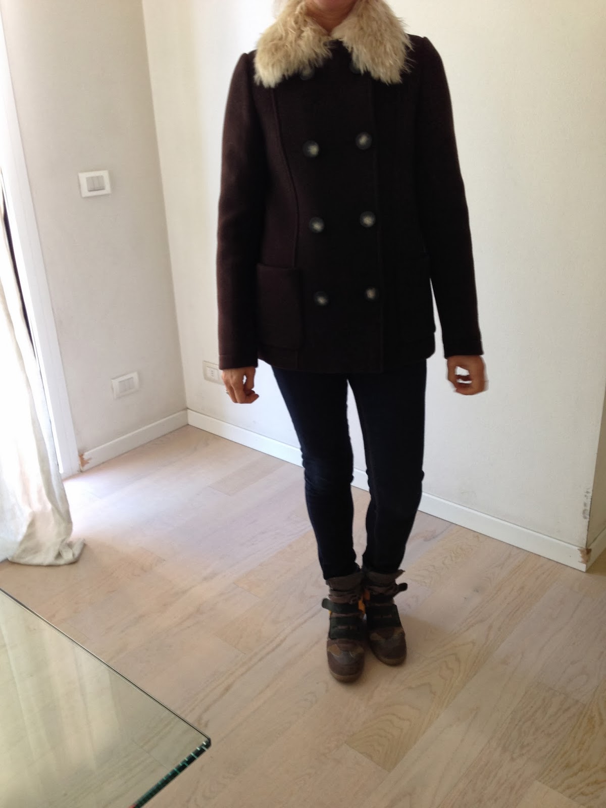 Giaccone in panno marrone modello doppio-petto e collo in eco-pelliccia; skinny jeans blu scuro; sneakers con zeppa interna.