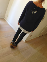 Maglione di lana blu con motivo di nastro sulla schiena, t-shirt bianca modello morbido.