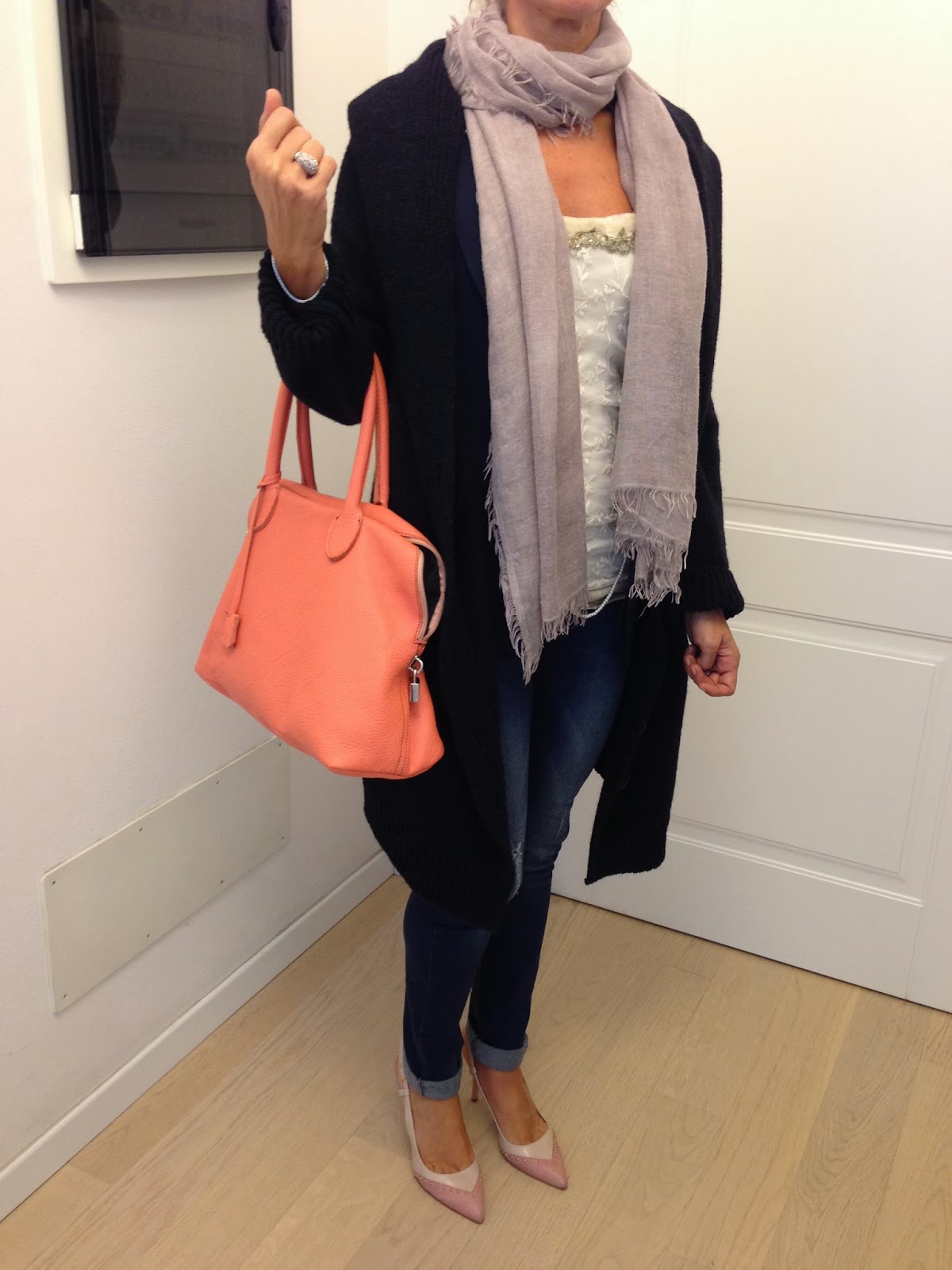 Eh già, queste prime mattine di ottobre sono proprio fresche; quindi stamattina ho “adottato” una giaccona modello over con cappuccio di colore blu e una pashmina rosa polveroso