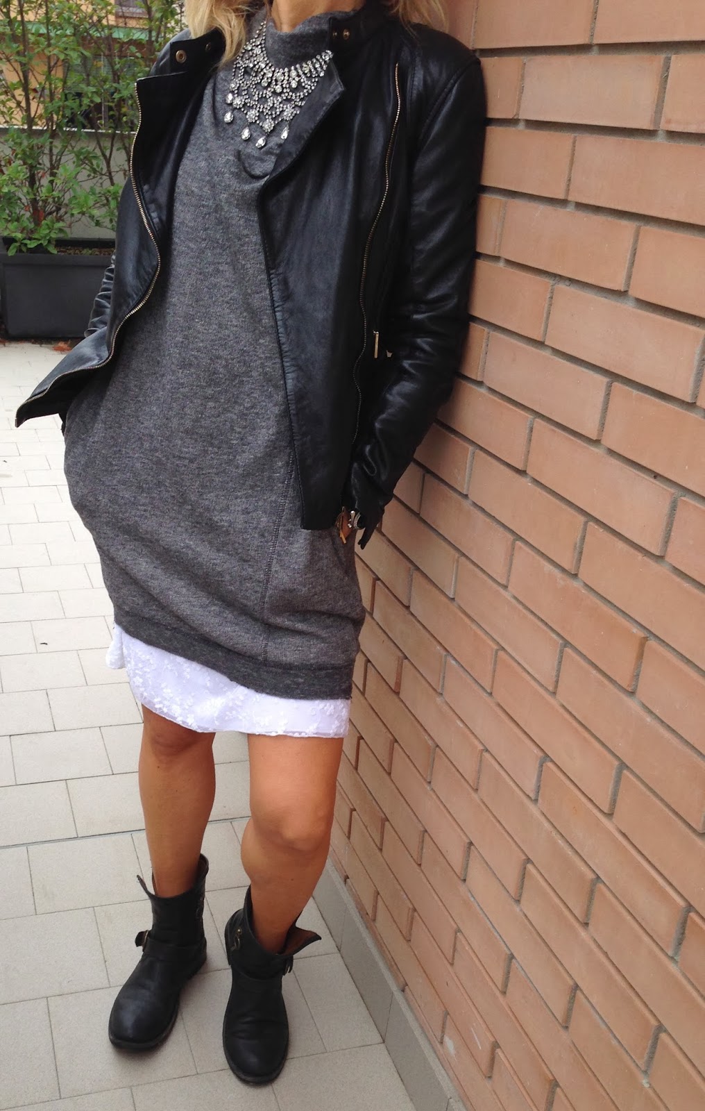 sotto la felpa, per poterla portare come un abito, ho indossato una sottoveste bianca in jersey con pizzo nel fondo