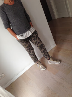 Sotto: t-shirt comoda, maglione girocollo grigio melange, pantaloni in felpa con stampa camouflage e sneaker.