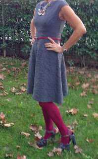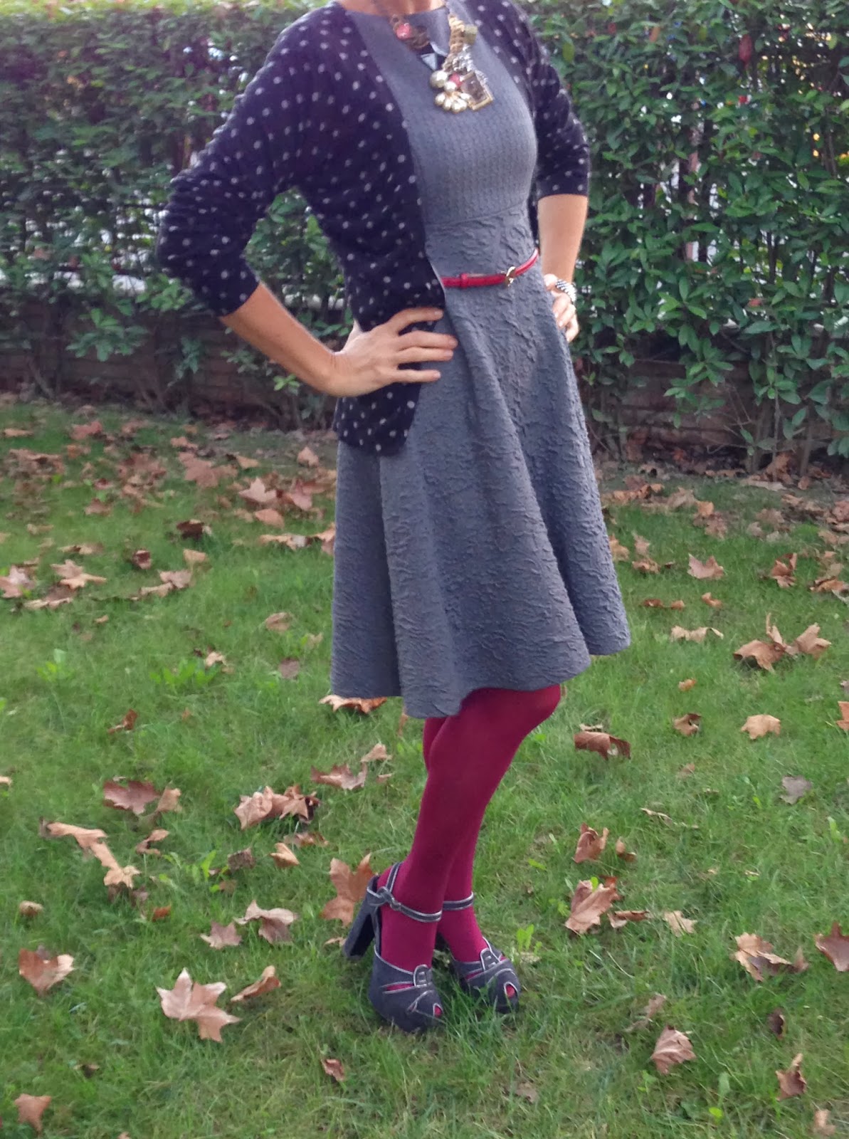 ho abbinato a questo abito ad un cardigan grigio antracite con pois grigio perla
