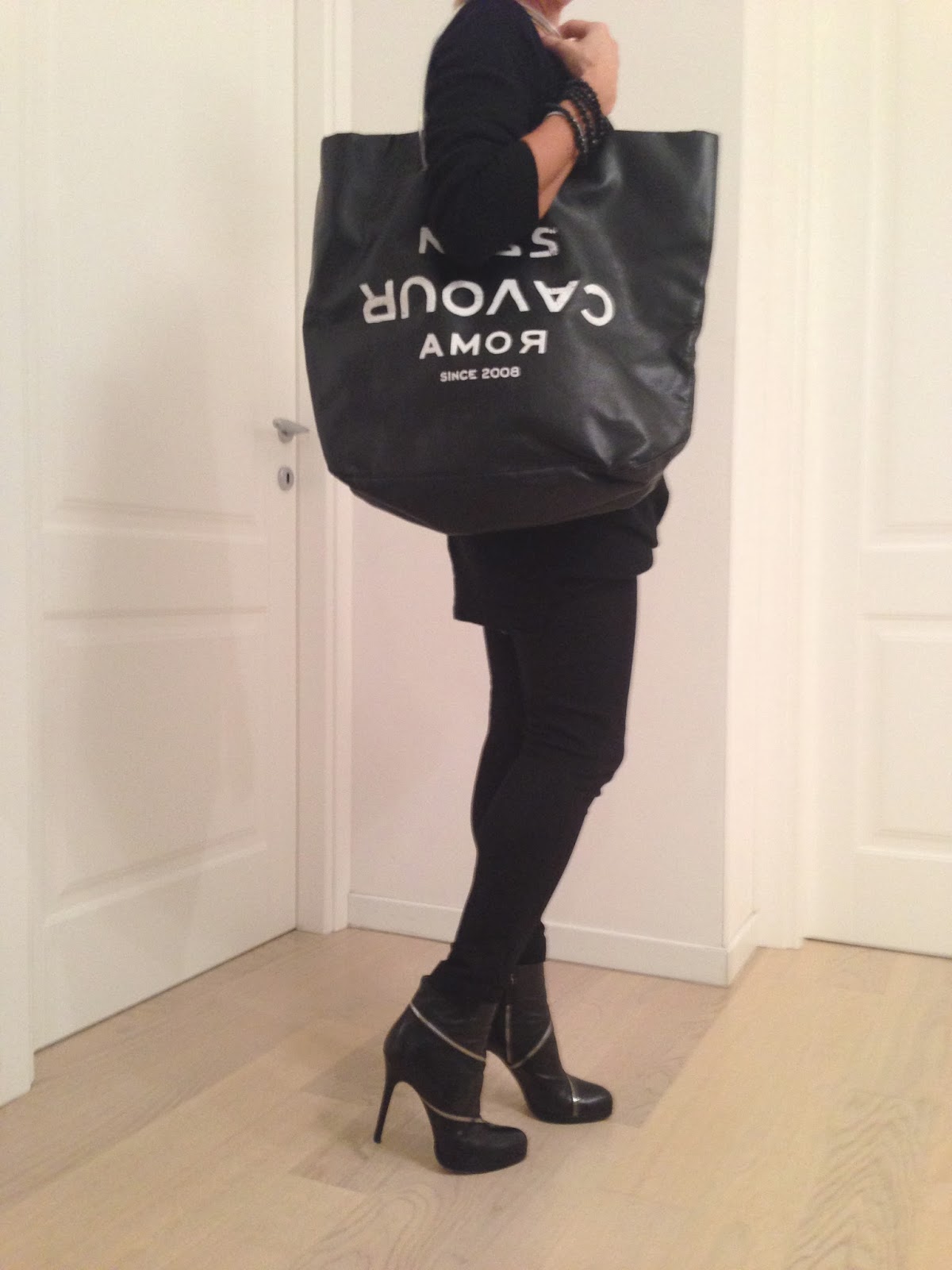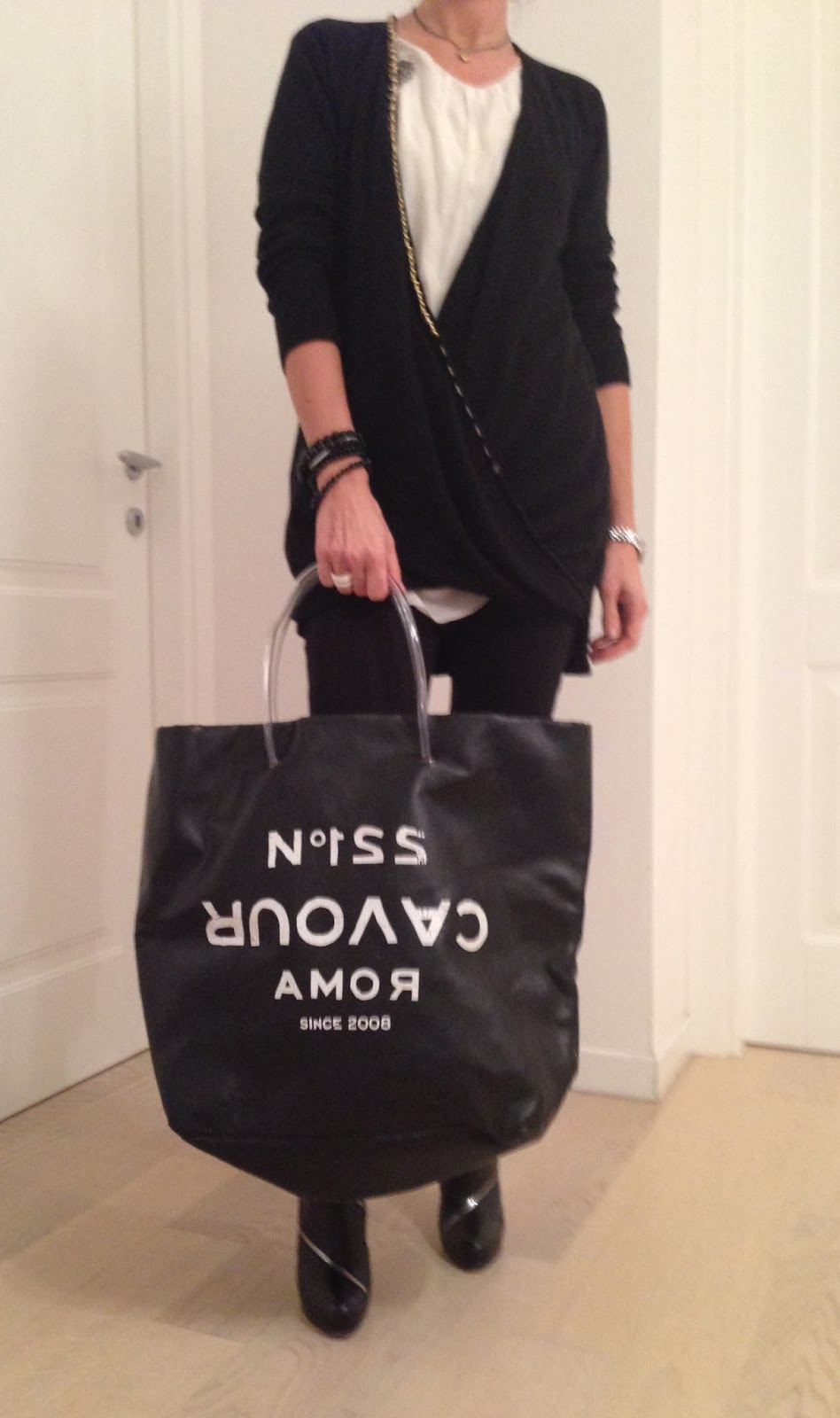 per questo mood ho scelto una maxi-shopping nera con scritte panna,