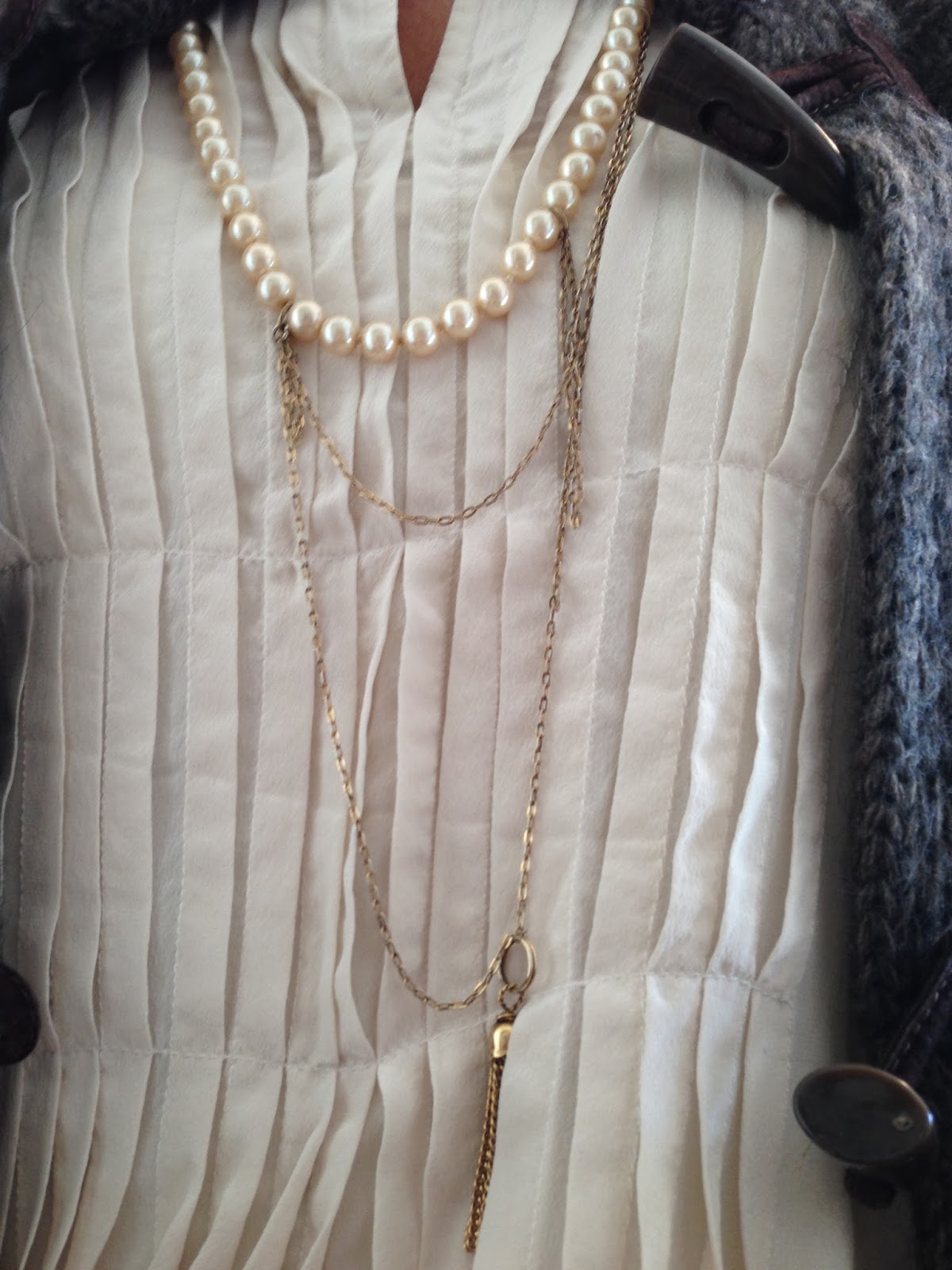 Mi piace moltissimo la blusa panna e adoro il filo di perle, un tocco decisamente chic.