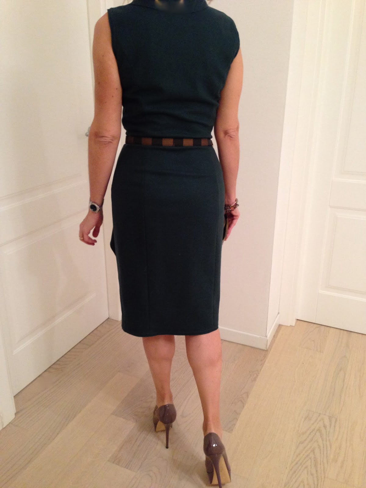 l’abito è al ginocchio, un modello a matita, senza maniche,