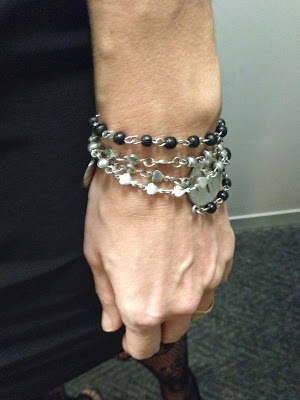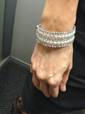 per valorizzarlo solo due bracciali, uno di strass e perle, l’altro a rosario con grani neri