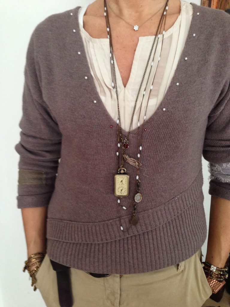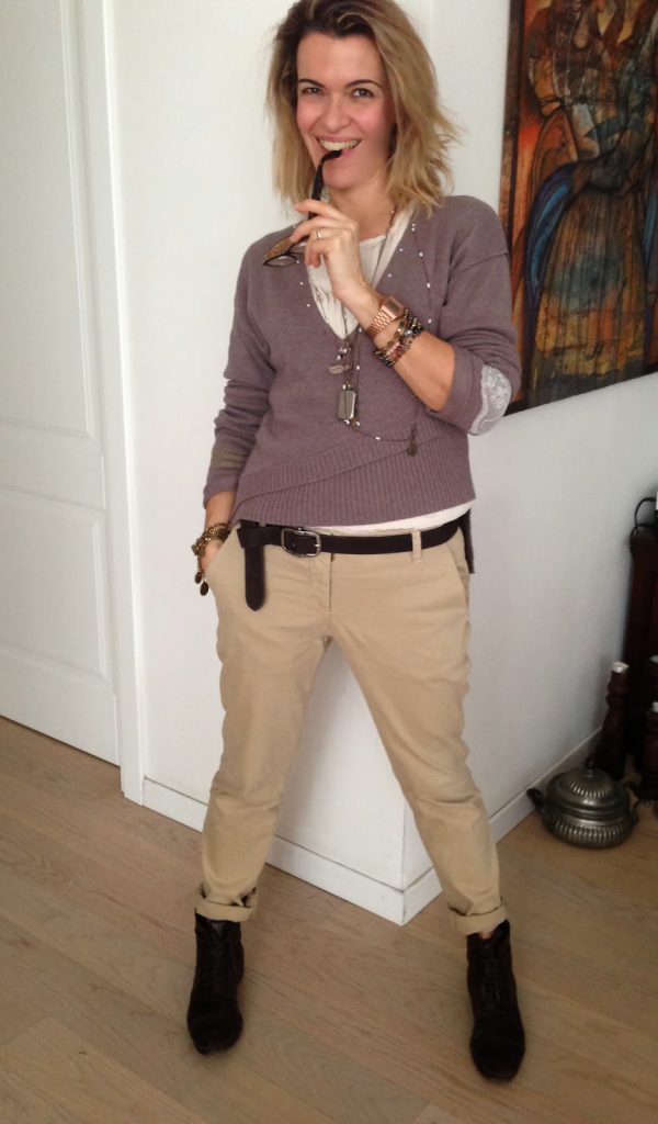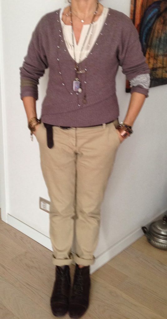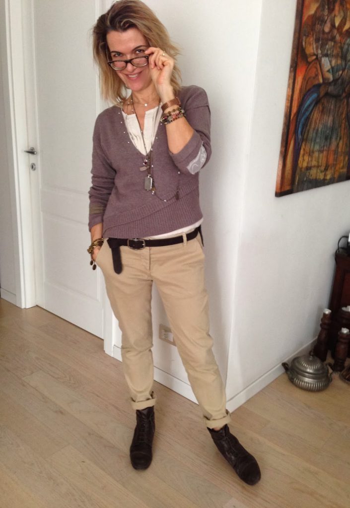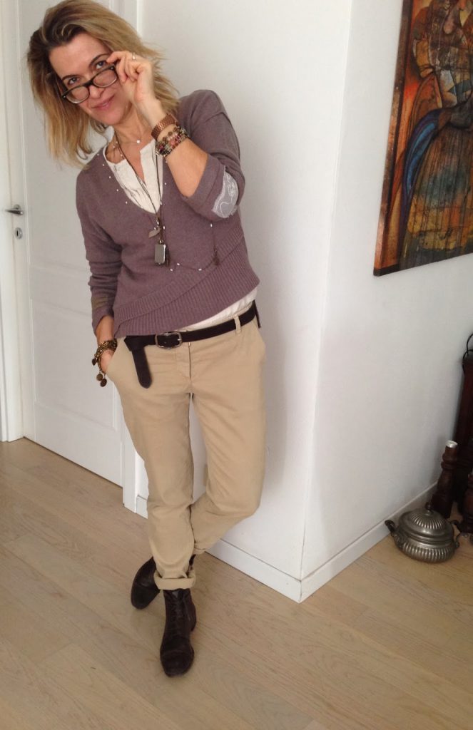 che bel look.è tutto perfetto dal maglioncino di cui amo il colore al pantalone per il taglio