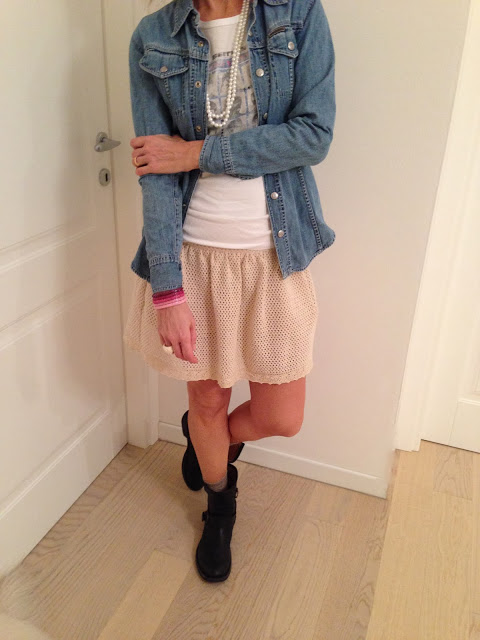 Sofi è proprio brava questo look è fresco e vivace, adoro in particolare la gonna crochet che sta benissimo abbinata alla camicia in denim.