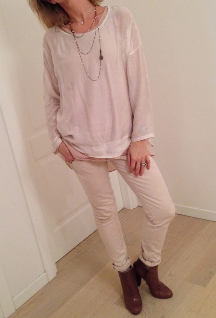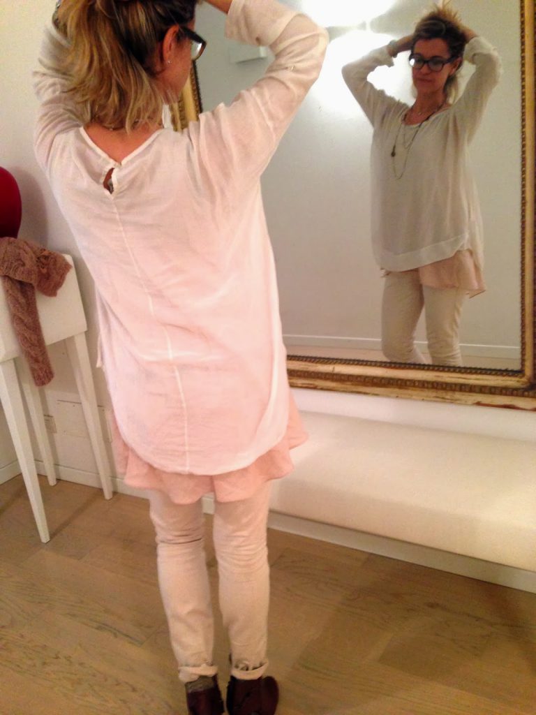 blusa in seta colore off-white portata sopra ad una canotta in jersey e seta colore rosa cipria