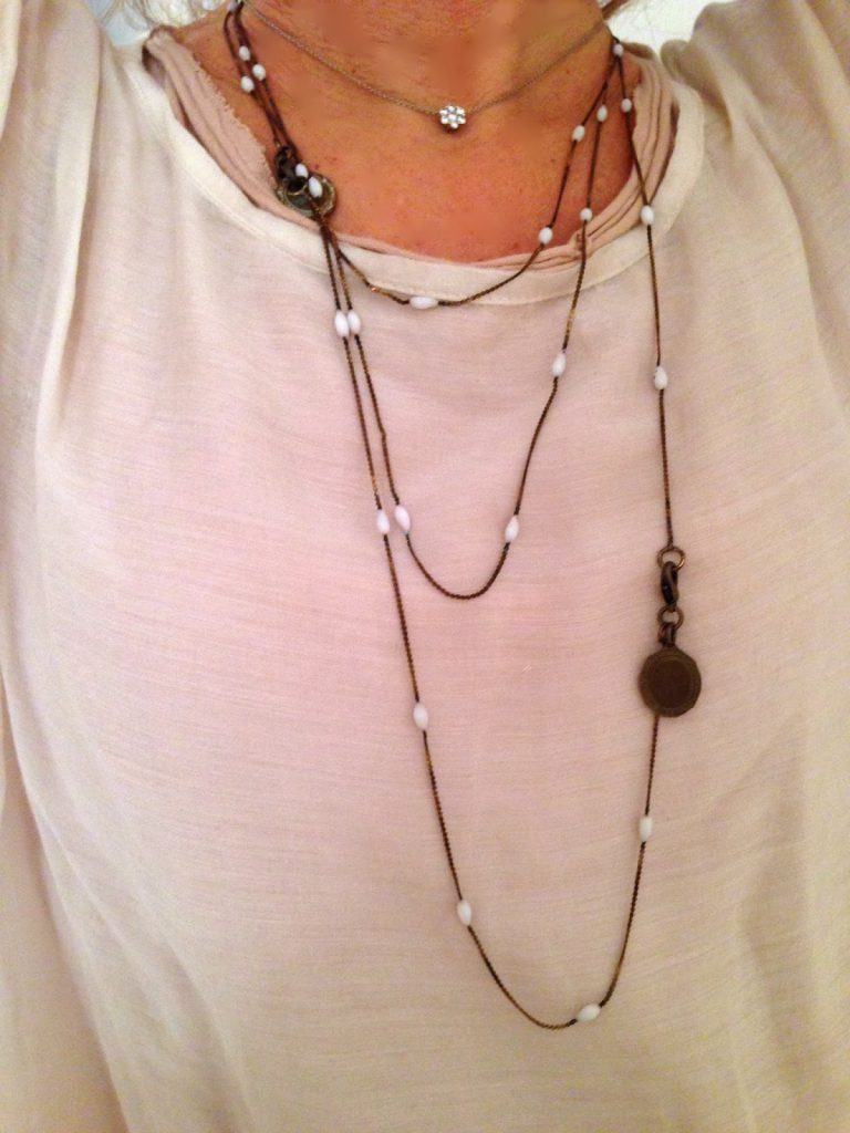 collana in metallo invecchaito con gocce di vetro bianco
