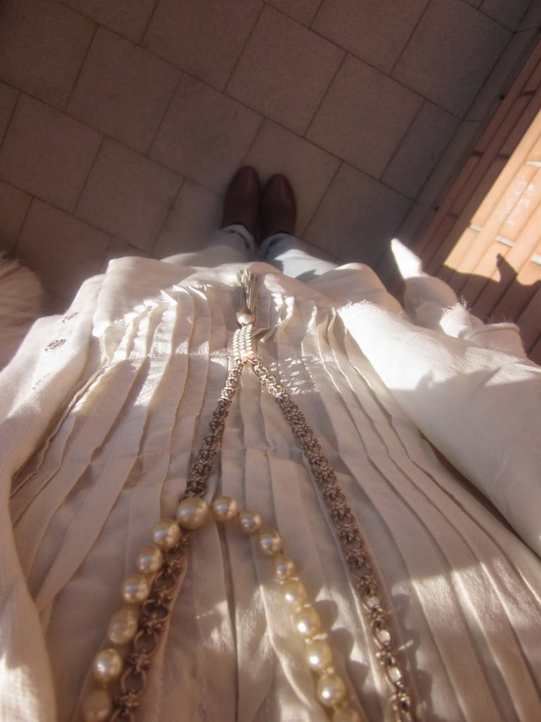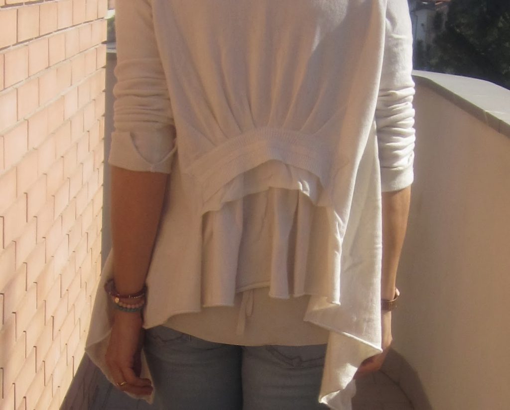una giacca di morbida lana colore cipria con volant sul davanti e motivo sulla schiena