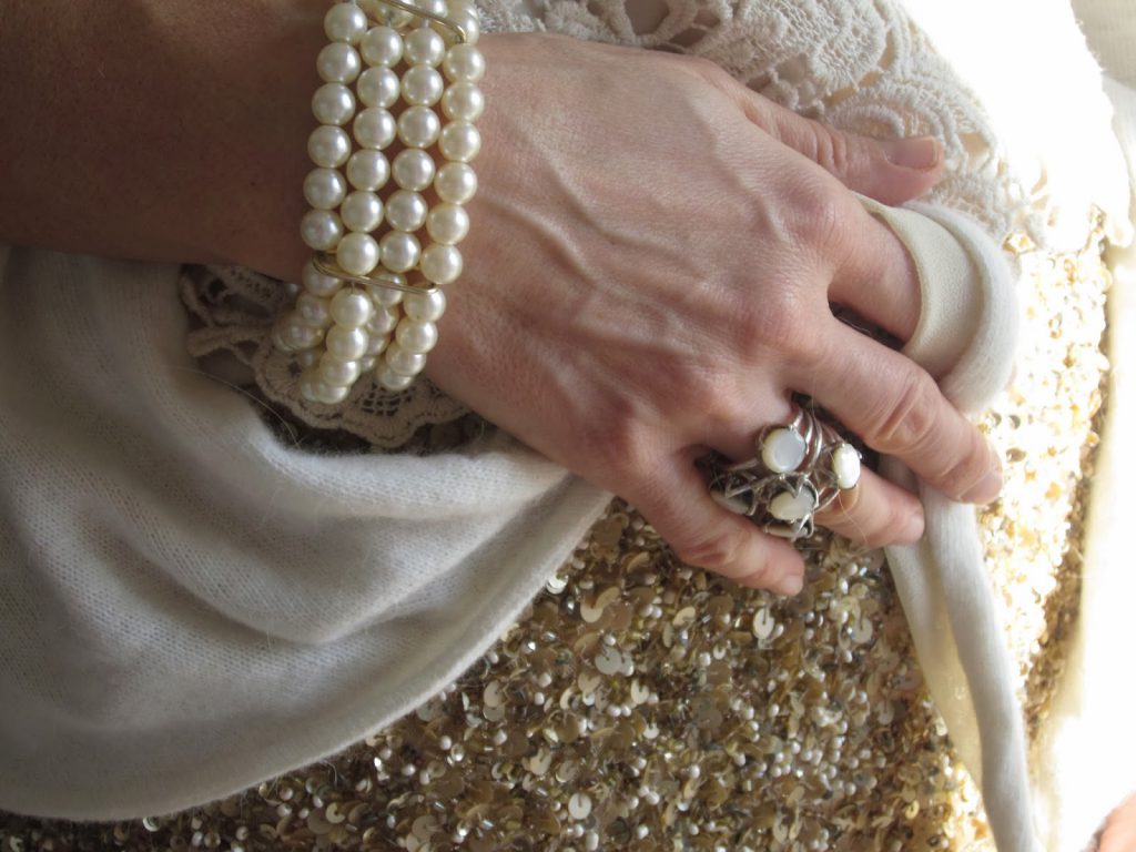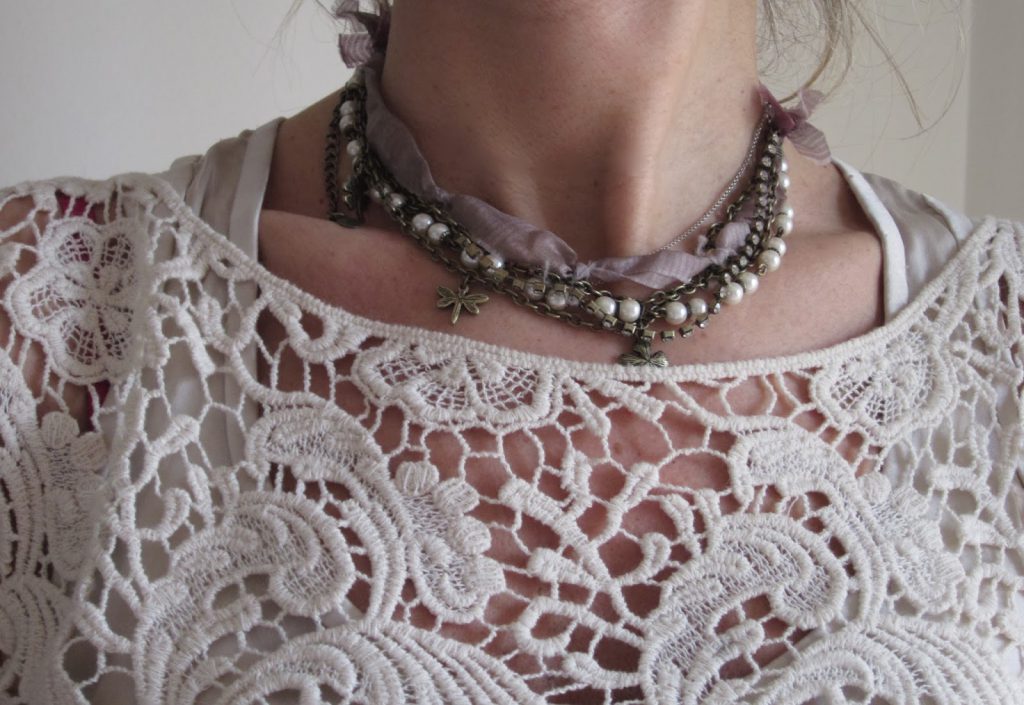 collana in metallo invecchiato con perle, ciondoli e tessuto