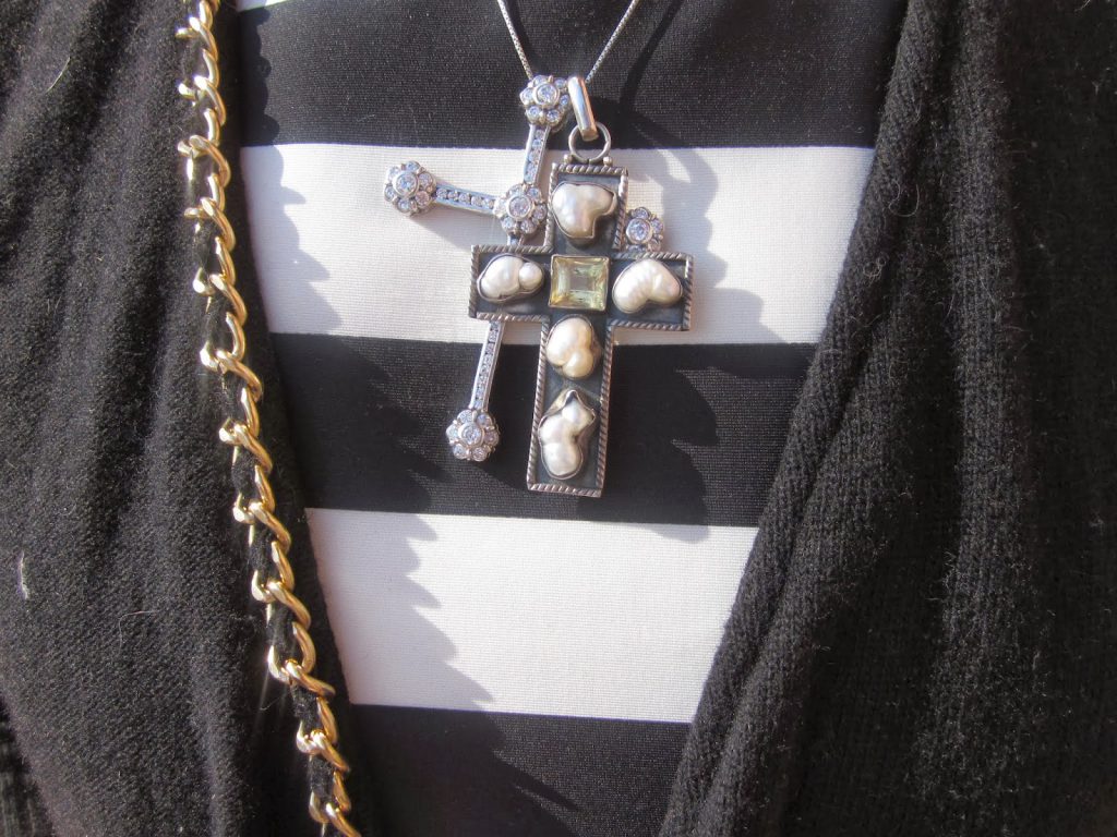 due croci nella stessa catena : una in argento e zirconi, l’altra in argento, perle e topazio