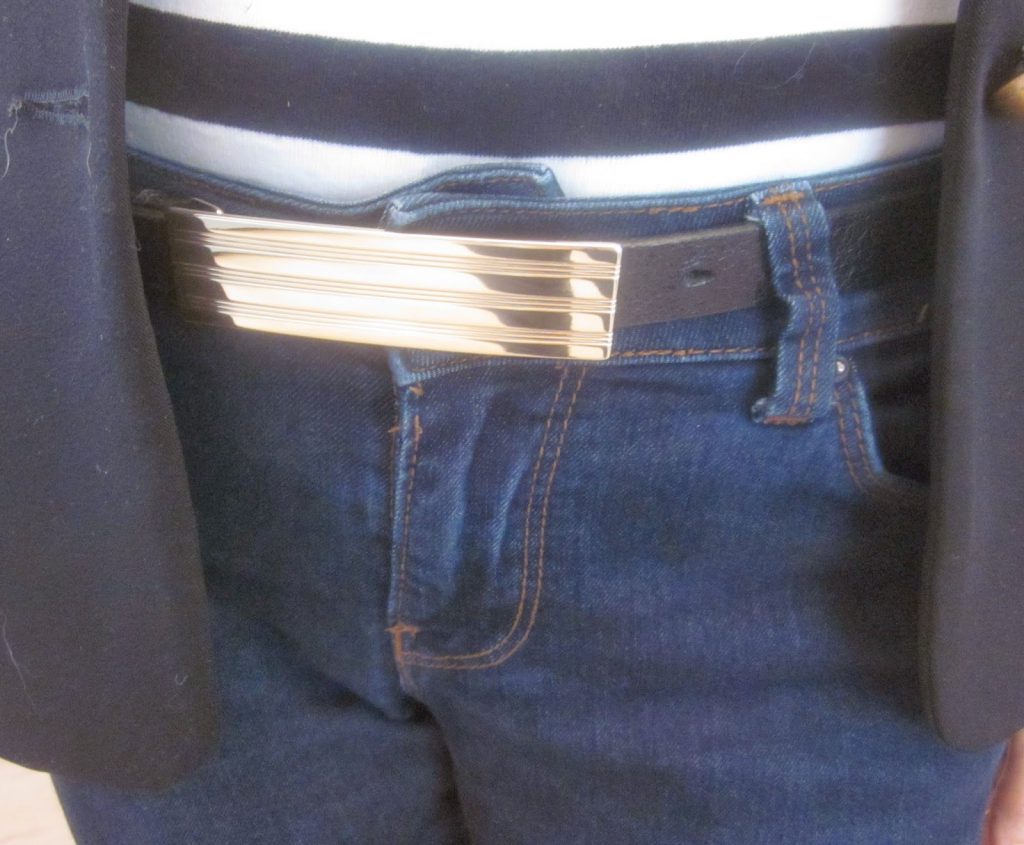 una cintura con fibbia in metallo e t-shoes in pelle nera……