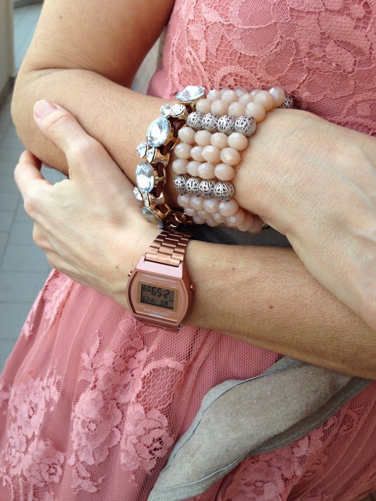 un bracciale con pietre dure rosa, un altro con strass giganti