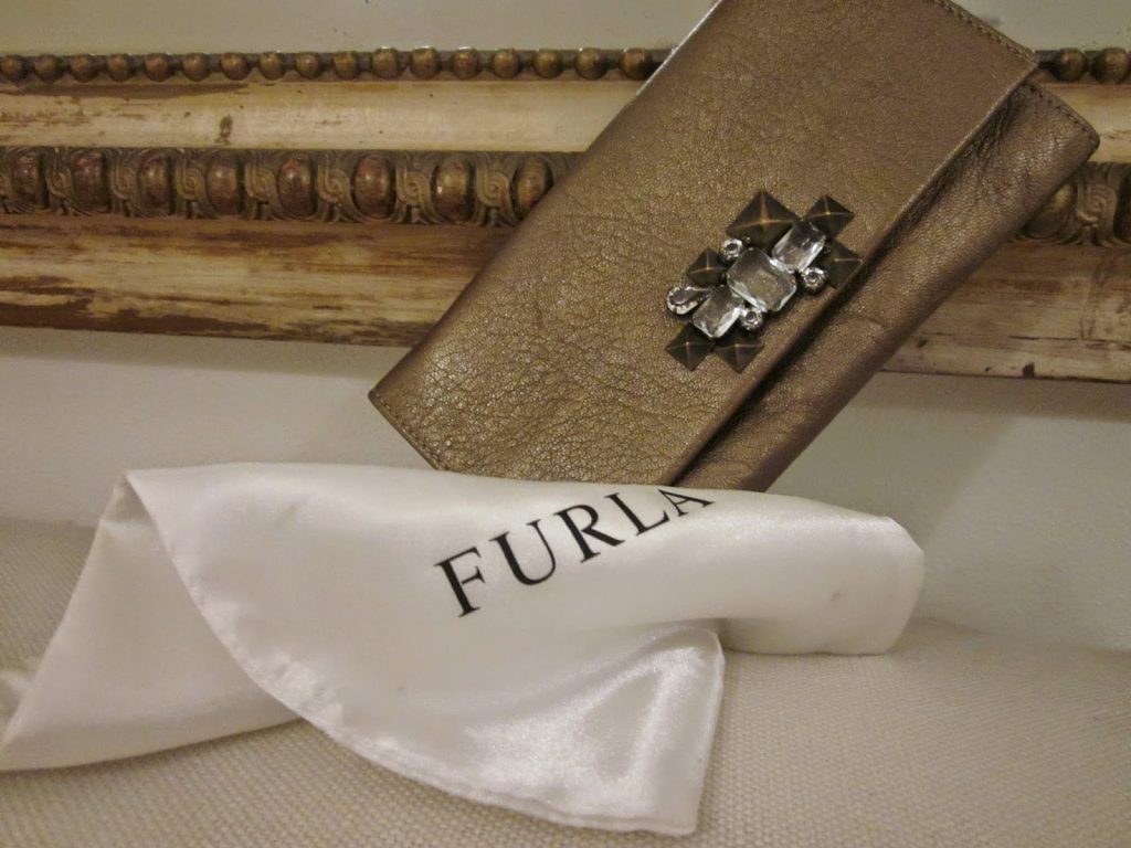 con una bustina in pelle bronzo arricchita da una chiusura-gioiello con strass e pietre