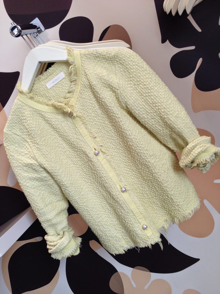 una giacchina gialla in tessuto e stile Chanel
