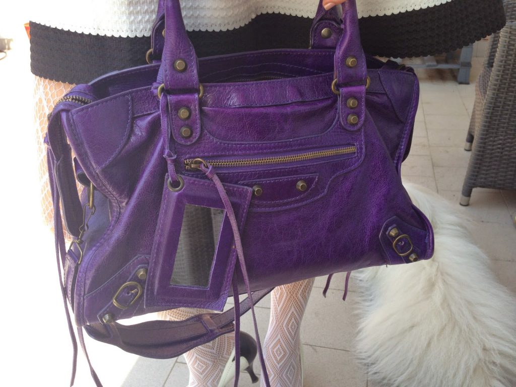 borsa in pelle viola a richiamare il ricamo della tee