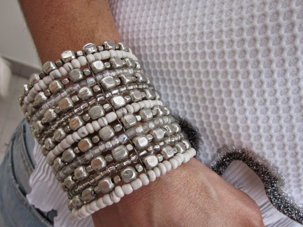 bracciale con perle bianche e metallo cromato