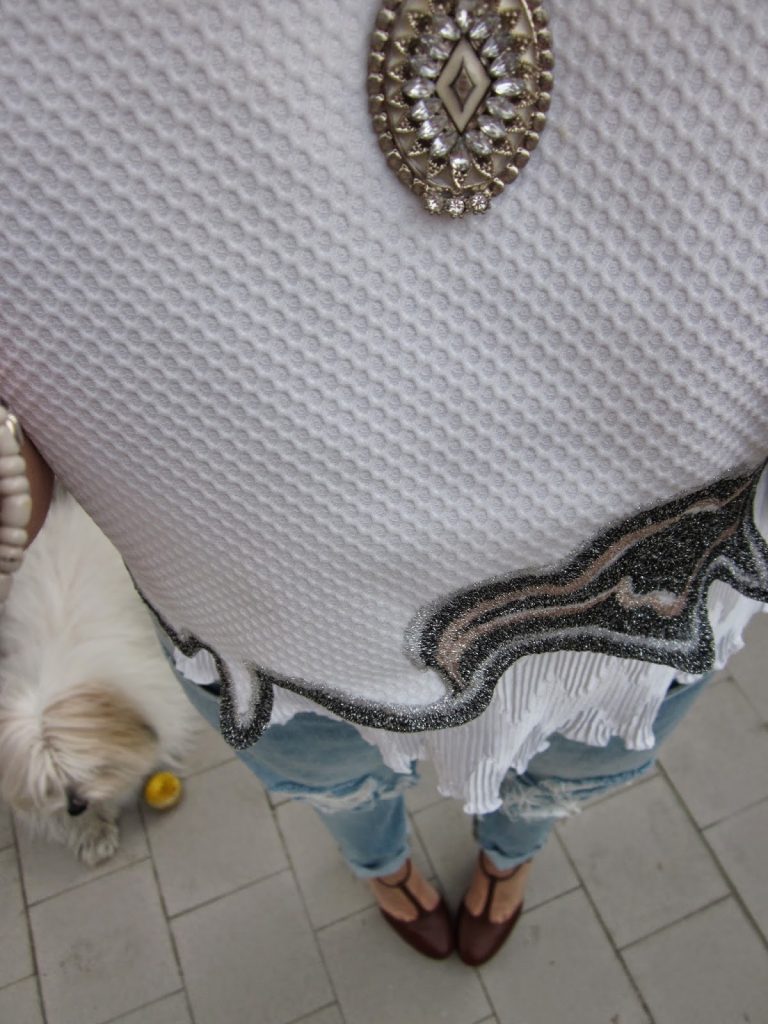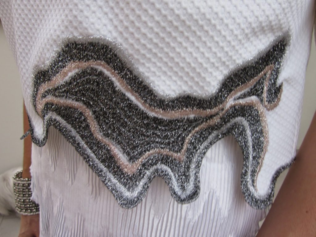 un crop-top in tessuto tecnico bianco a nido d’ape con ricamo lurex nel fondo