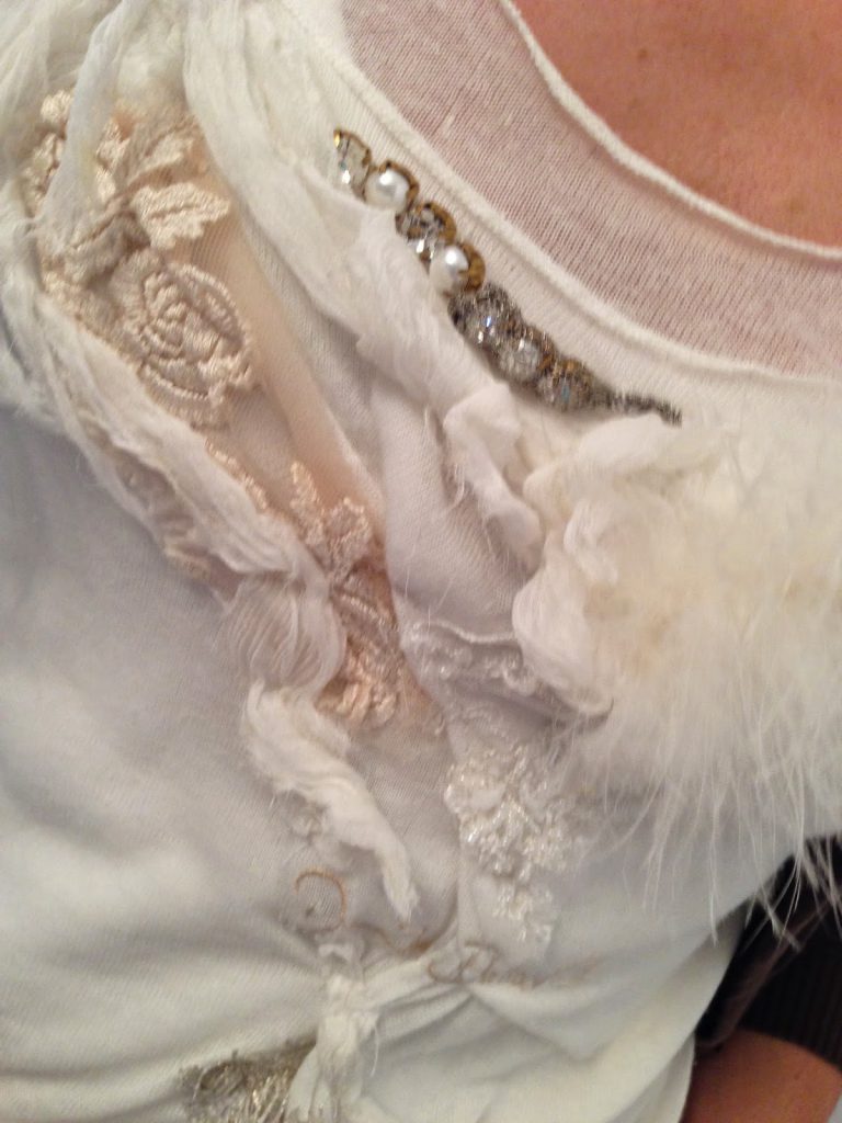 una t-shirt originale, con applicazioni di diversi materiali,