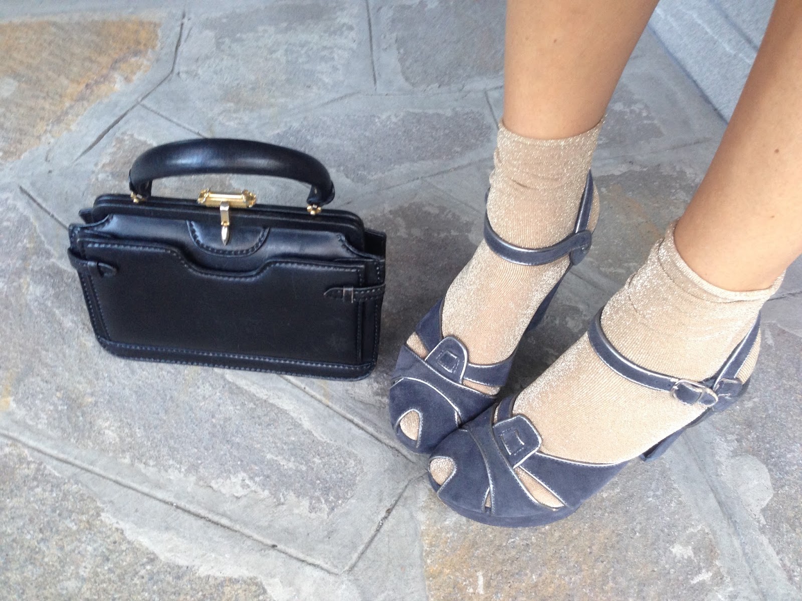 calzini lurex e sandali in suède, accessori dorati…