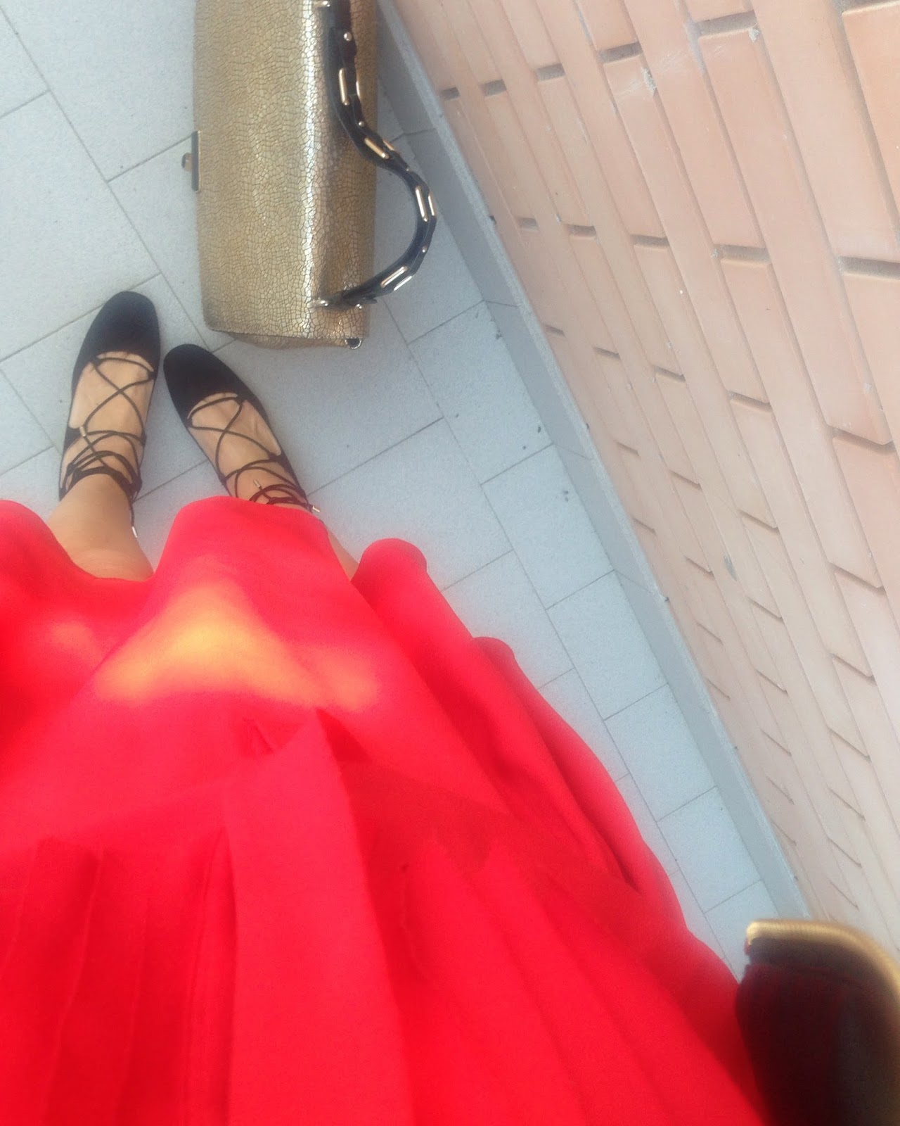 | red dress, lace up shoes, metal bag |