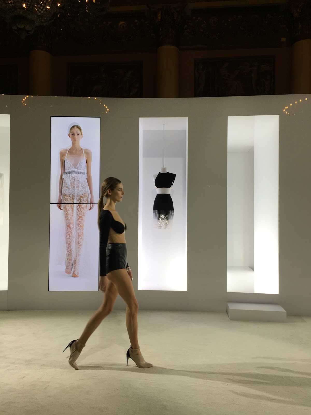 con effetti di degradé, tagli laser, tulle color nudo e PVC trasparente.