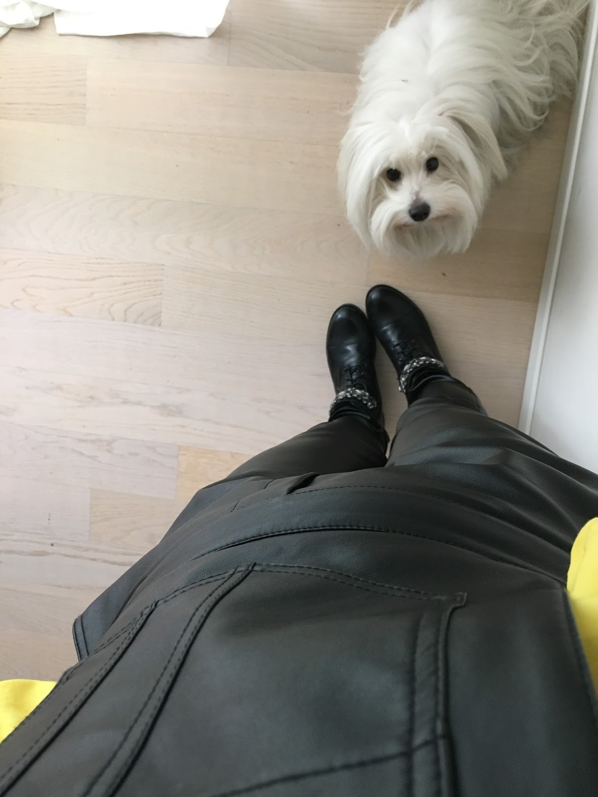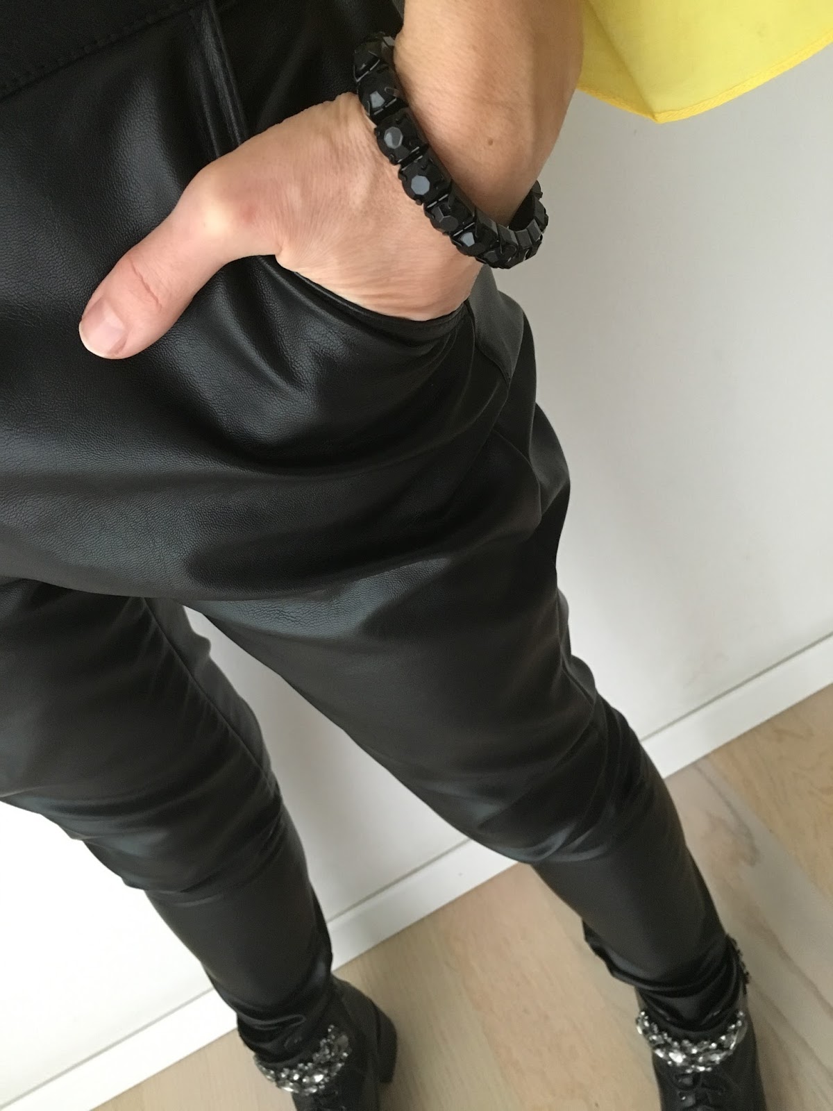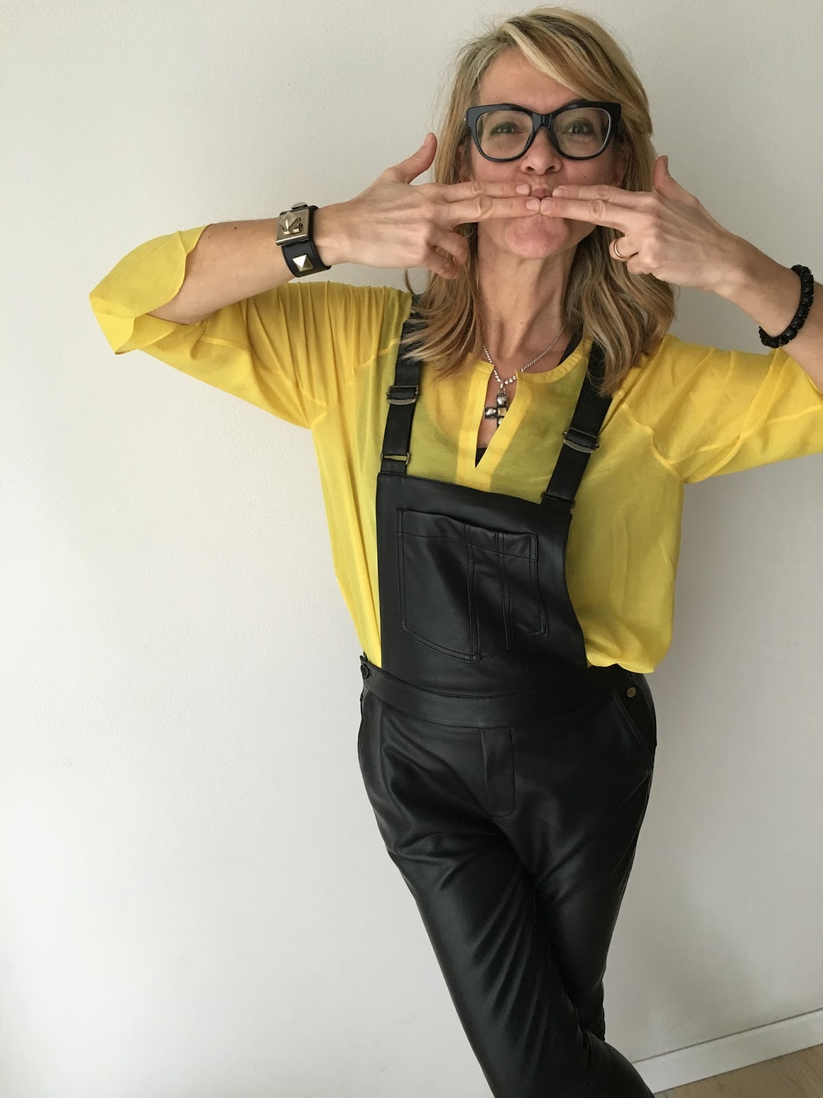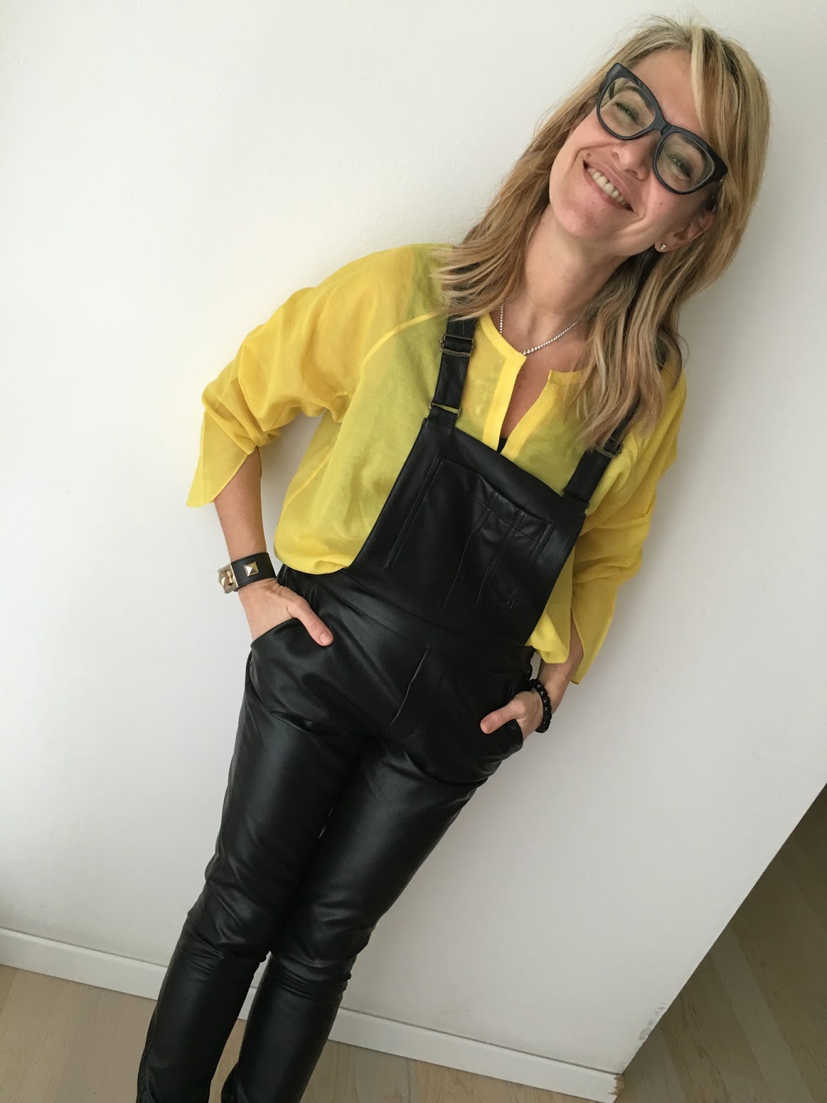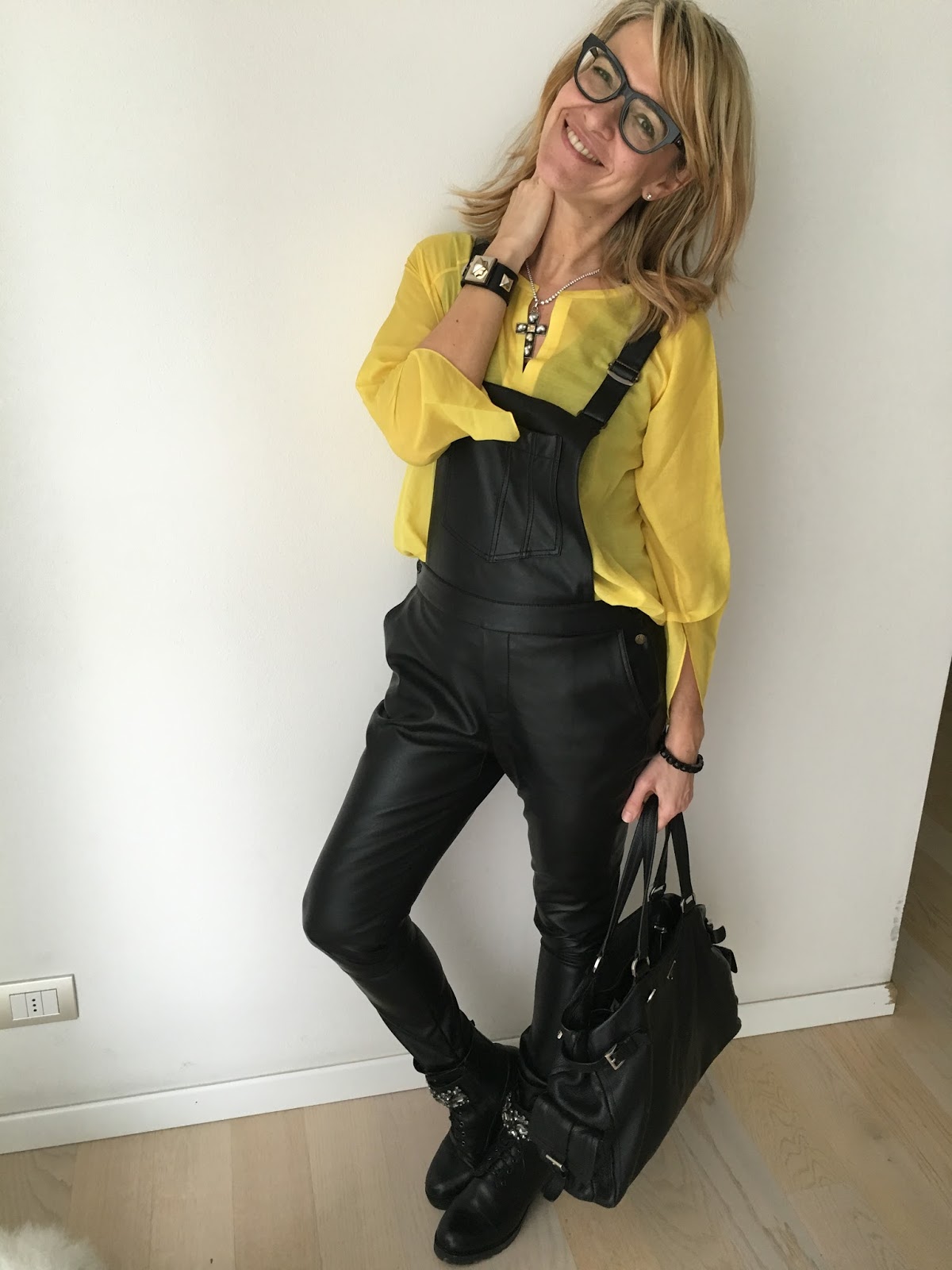 ti stanno proprio bene questi nuovi occhiali cara … la salopette in ecopelle con la blusa gialla in contrasto è un amore!!!!