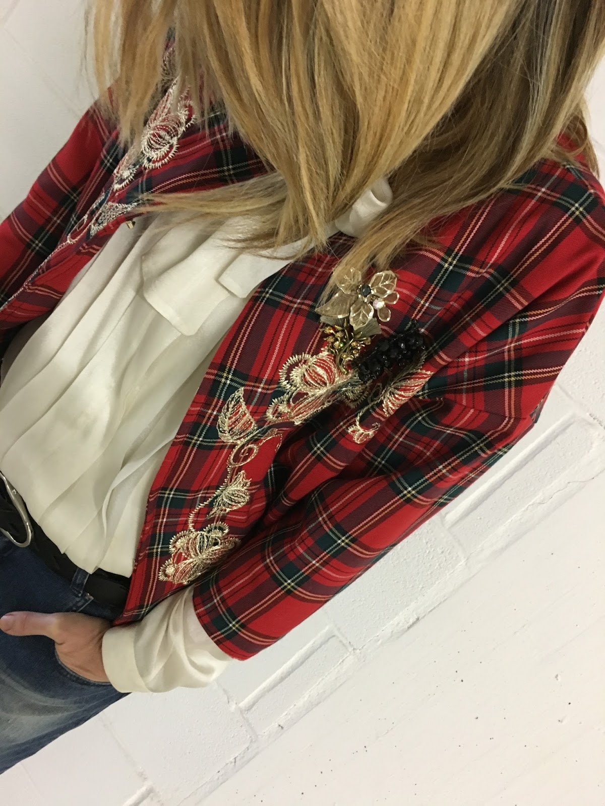 ad una giacca morbida con maniche a tre quarti in fantasia tartan e con ricami dorati
