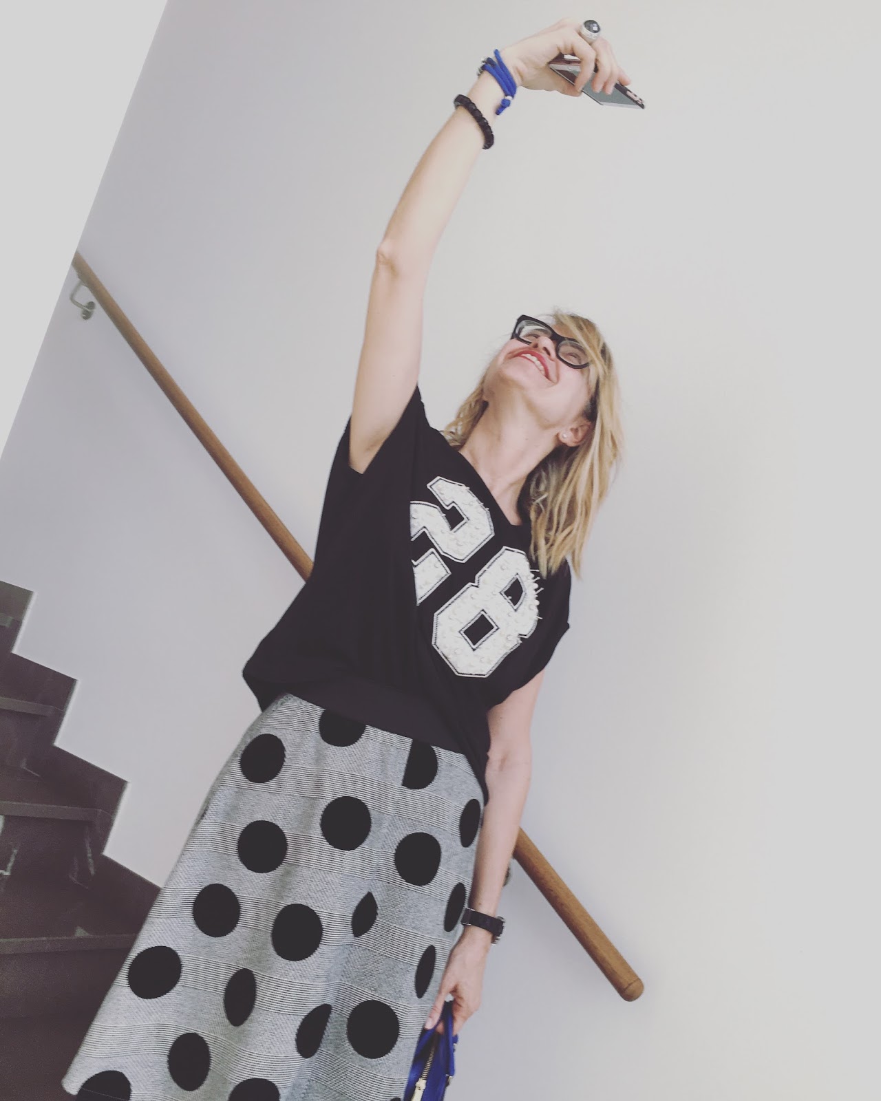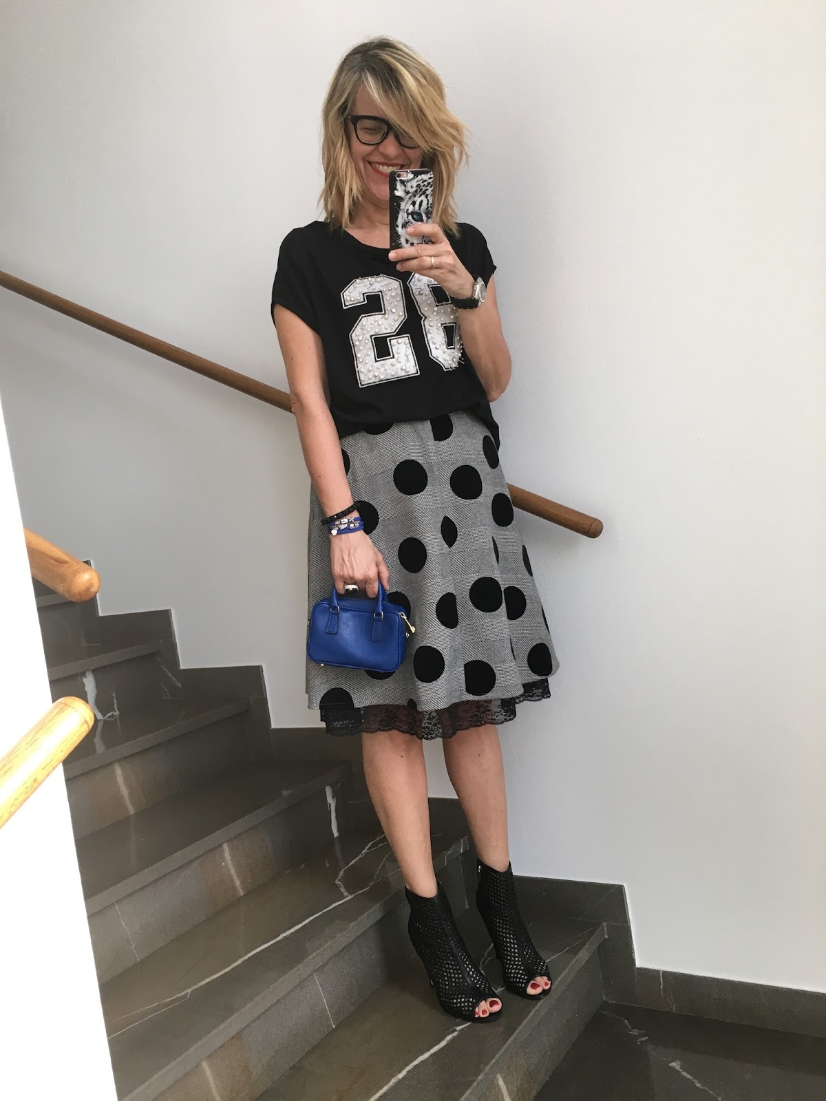 indossando una t-shirt dal taglio sportivo ed una gonna dai maxi pois.