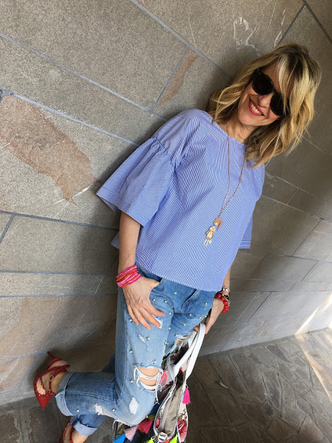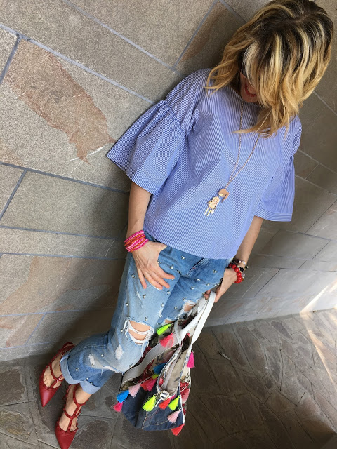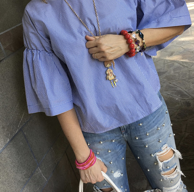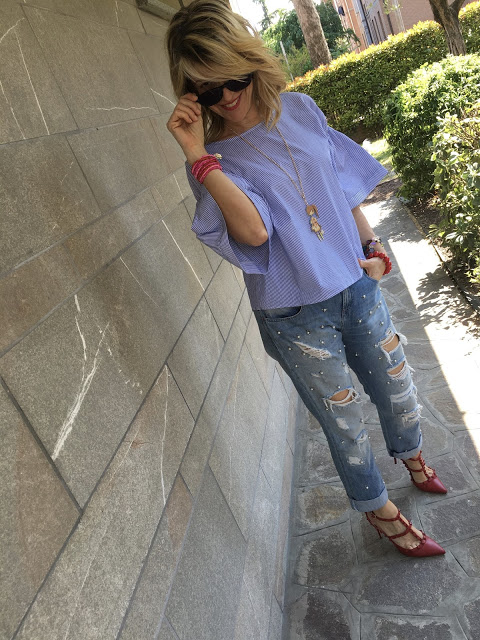 Sai Gina, abbiamo tanti gusti in comune…..la camicia a righe azzurra, la collana con la bambolina….mi piace tutto, i tuoi look sono sempre adorabili!!!!