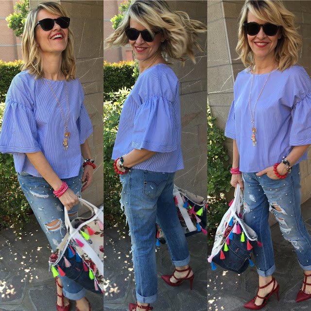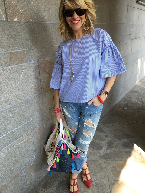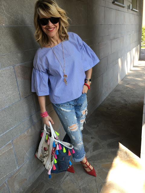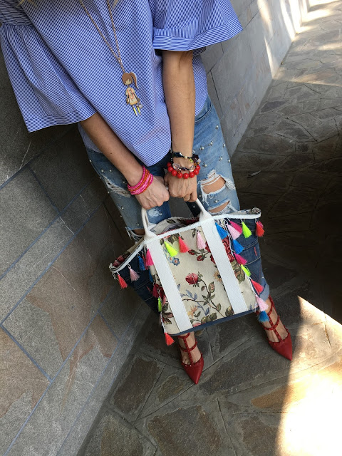 Beautiful outfit! I really like your top and the colorful pom-pom bag!
