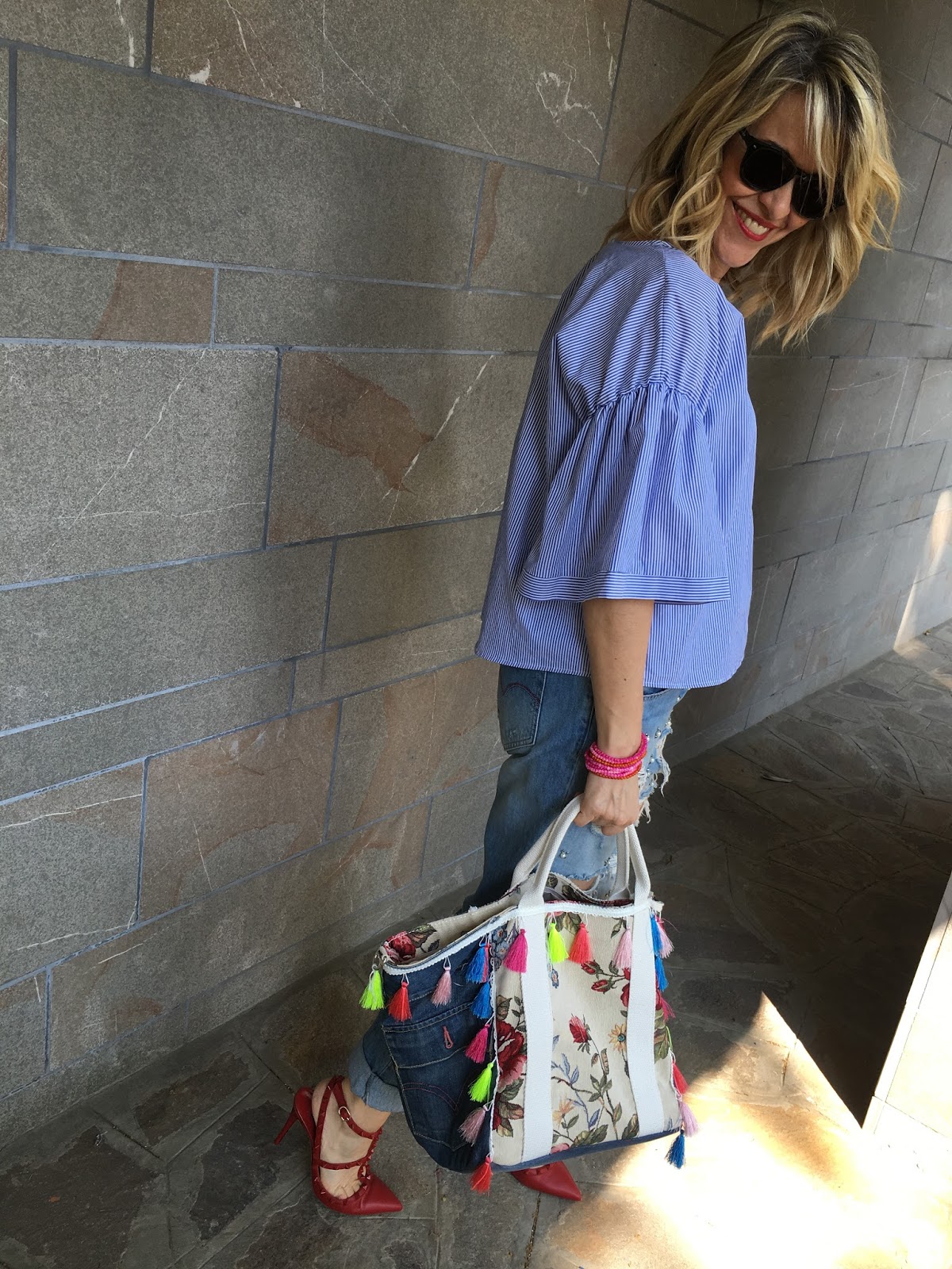 Beautiful outfit! I really like your top and the colorful pom-pom bag!