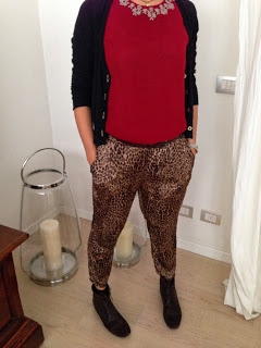 Blusa senza maniche in chiffon rosso con ricami in lurex argento intorno allo scollo; cardigan nero con ricamo floreale sulla manica sinistra; pantaloni in viscosa stampa animalier; cinturina…