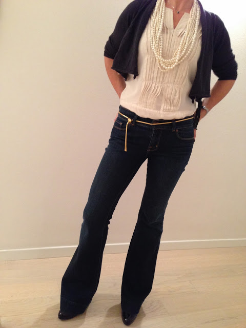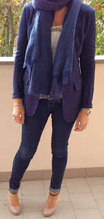 Come potete vedere, oggi ho scelto un mood da “signorina” adatto per l’ufficio e per un aperitivo…. coprispalle in lana blu blusa in seta panna con motivo di…