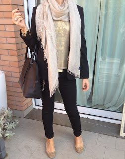 Visto il clima, ancora caldo e soleggiato, oggi un look Black & Gold blazer nero con bottoni dorati sciarpa in garza di lana beige borsa in pelle…