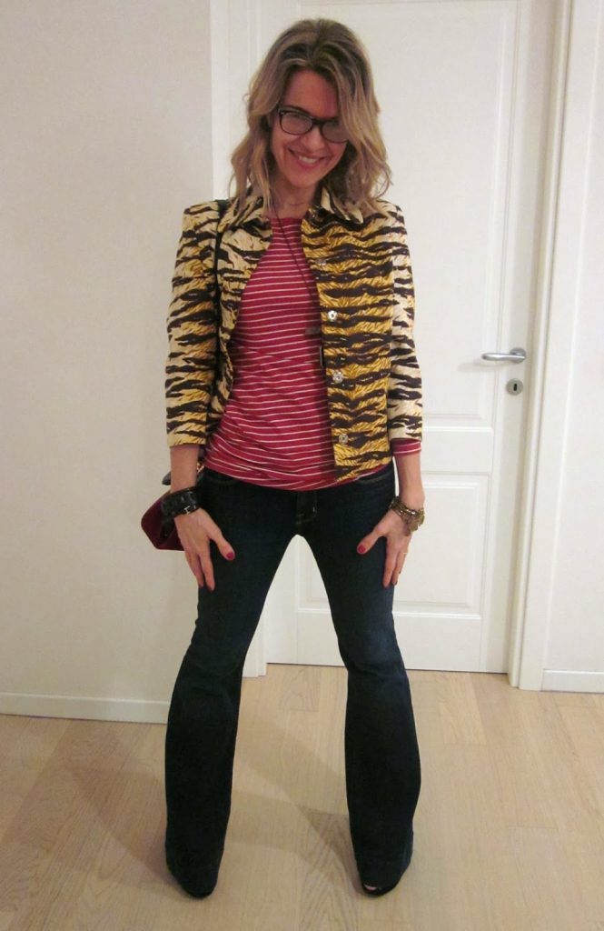 una giacca dal modello a trapezio e con manica a tre quarti….. ….stampa animalier….ormai un classico, un ever-green abbino questa stampa alle righe una tee rossa con righe…