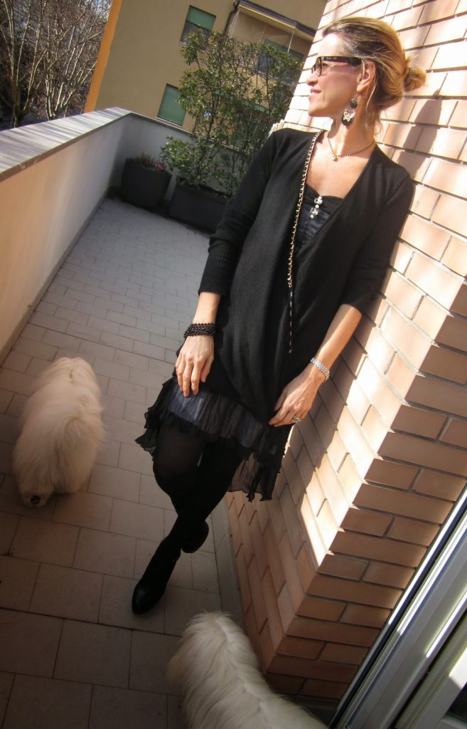 finalmente il sole è tornato e la temperatura è mite! mi concedo qualche scatto all’aperto, mi accompagnano Sofy e i miei fidati cucciolotti….. indosso un abito elegante, quasi…