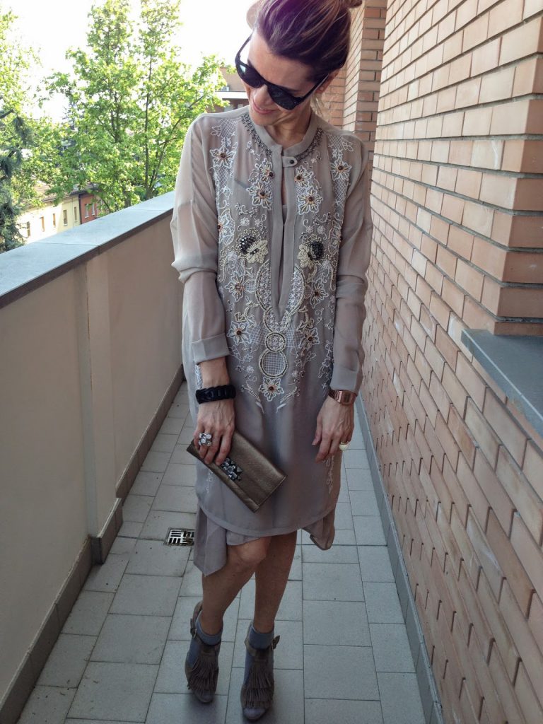 questa tunica così raffinata nella forma, nel colore e nei ricami mi riporta ad immagini coloniali nel deserto…. a penombre di palmizi di un’oasi sahariana….. così mi ci…